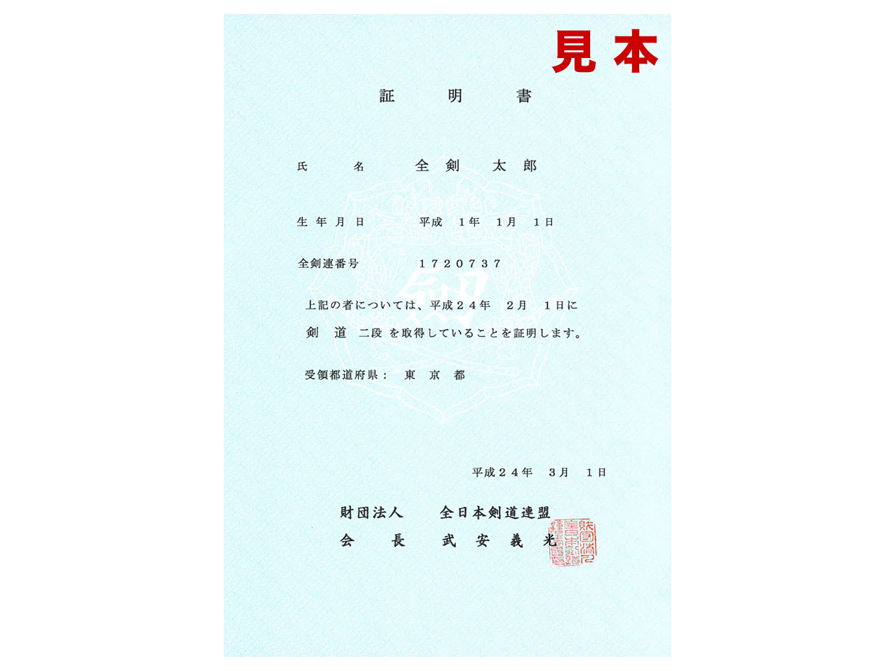 ・A B5 copy of the certificate will be converted to an A4 certificate with the All Japan Kendo Federation logo and watermark.